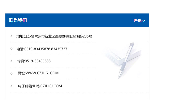 地址:常州市新北區友邦商務大廈1幢16、17層  電話:0519-85101652  傳真:0519-85112595  郵編:213022  網址:www_cz-jiayue_cn.wzshuangqiang.com  郵箱:xiajifengaa@163.com